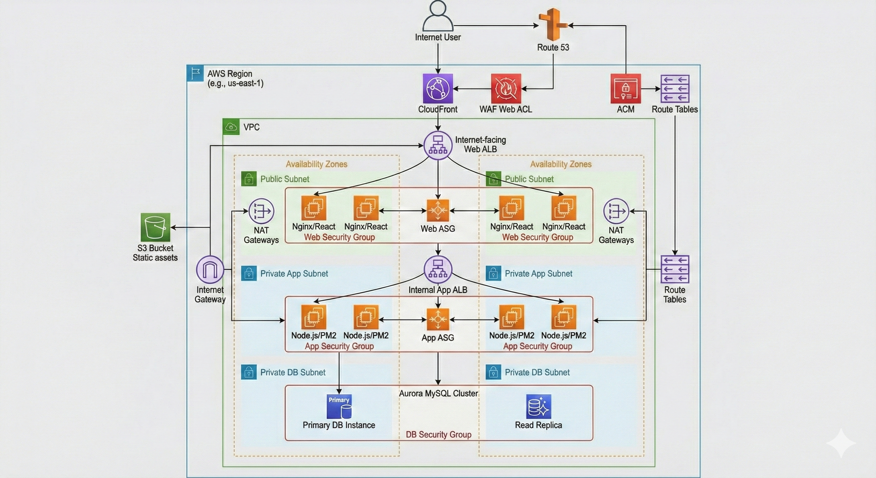 Designed highly available three-tier architecture using ALB, Auto Scaling Groups, and Multi-AZ deployment.